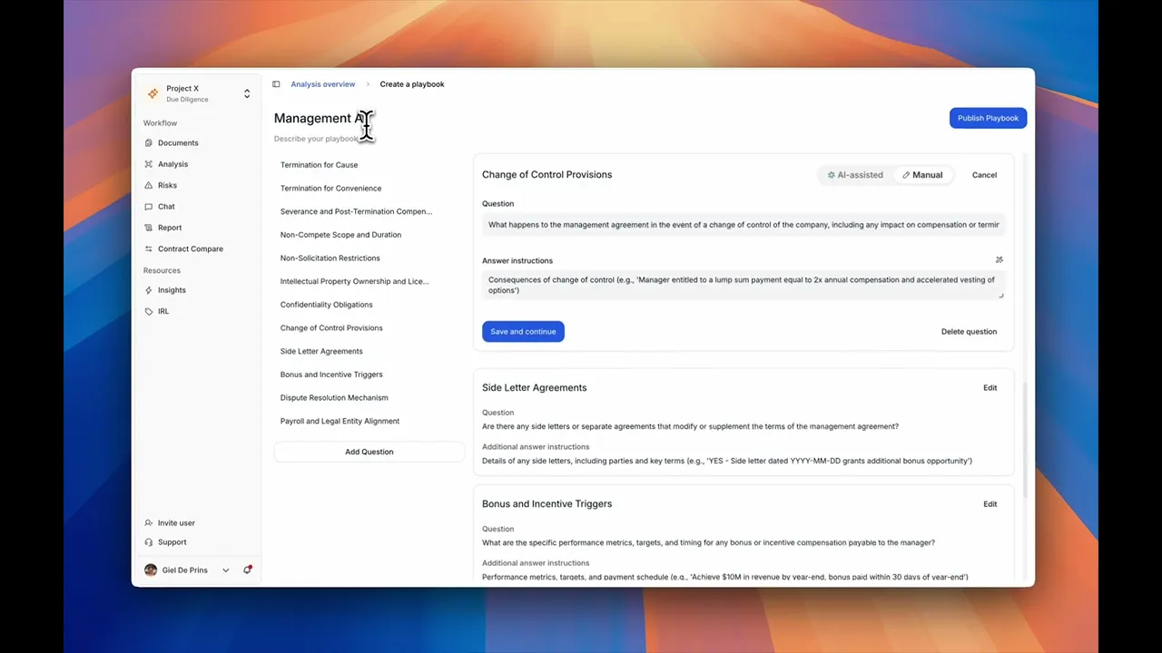 Jurimesh turns this into a structured playbook: a list of targeted legal questions, thresholds, and flagging rules tied to a specific contract type. Each question is automatically optimized for prompting, so the AI doesn’t just “search” but understands the legal nuance behind what you’re asking.